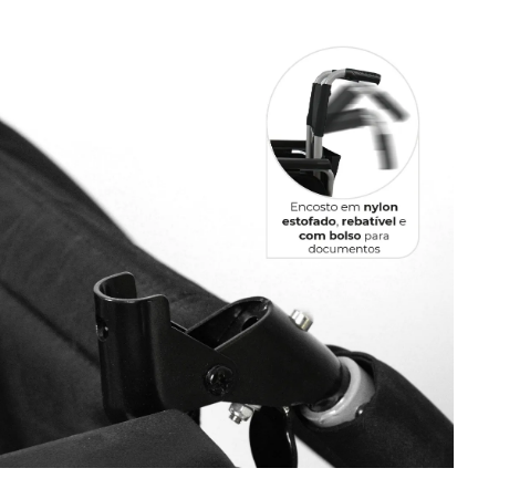 Encosto estofado rebatível (não reclinável) com bolso para documentos.