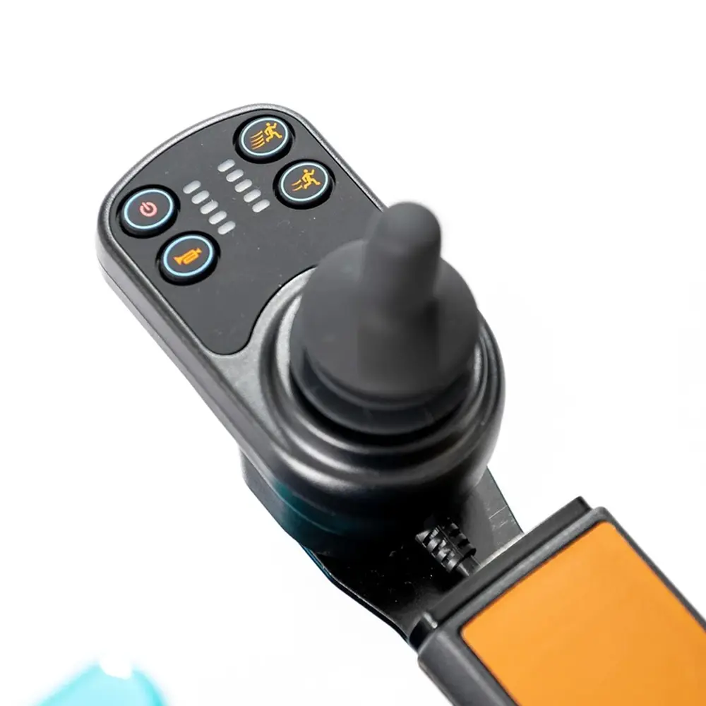O controle remoto permite que acompanhantes conduzam a cadeira à distância, ideal para manobras em espaços apertados ou quando o usuário não está com o joystick em mãos.