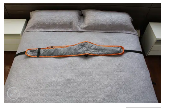 Coloque a cinta posicionada e presa no colchão ou na cama, deite o paciente por cima da cinta e prenda com as fitas nylon nas fivelas de metal. Ajuste com a tensão adequada.